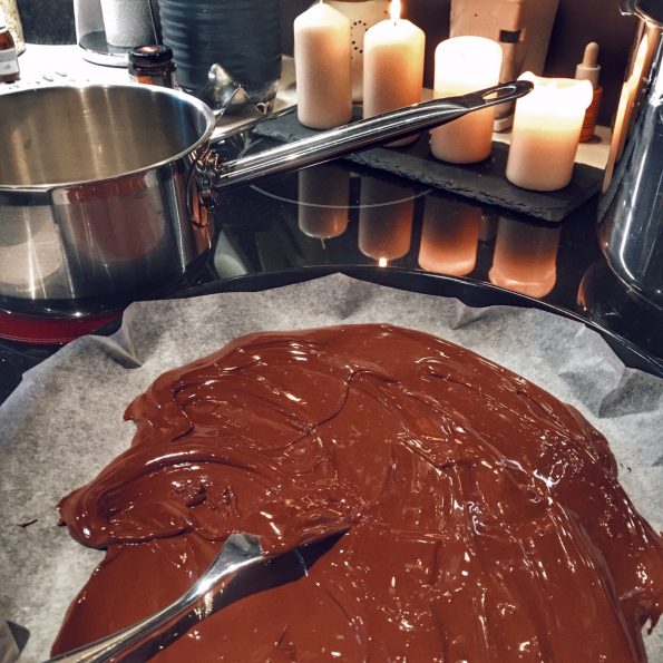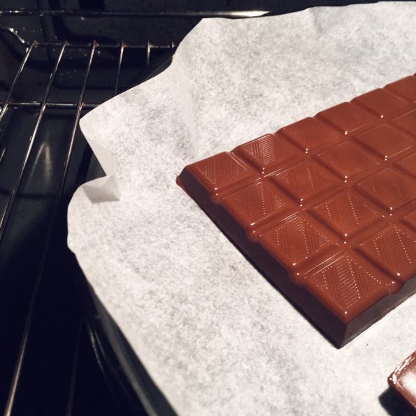 Pour la recette, rien de plus simple: on met au four préchauffé à 60 degrés une ou deux plaques de chocolat de 100 ou 200g, sur une plaque à gâteau chemisée de papier sulfurisé. On laisse fondre une petite dizaine de minutes. Alors ici, on est un peu des puristes du chocolat noir, mais si on mélange deux plaques différentes, en ajoutant par exemple du chocolat au lait, cela peut faire un joli dessin marbré qui fera son petit effet!