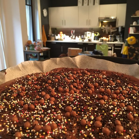 On repasse tout doucement avec la spatule propre pour enfoncer un peu la garniture dans le chocolat, histoire que ça prenne avec. Puis on met le tout, plaque comprise, au minimum une heure au frigo.