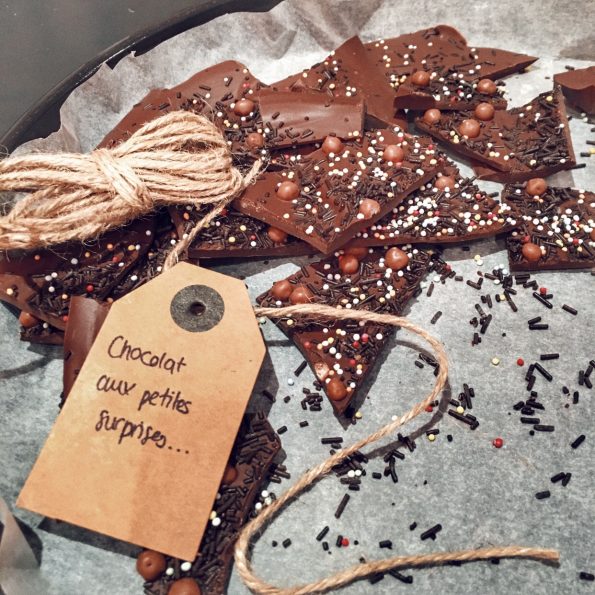 Aujourd’hui, je partage en coup de vent une recette simplissime pour de petits cadeaux à distribuer autour de soi: des tablettes de chocolat, ou plutôt des morceaux gourmands craquants-croquangs de chocolat cassé, à réaliser soi-même. J’ai trouvé cette recette dans le dernier magazine de « Swissmilk« , le site des producteurs de lait suisse. Pour cette recette, l’on peut même facilement intégrer son enfant dès 18 mois / 2 ans, notamment pour l’étape de la « décoration ».