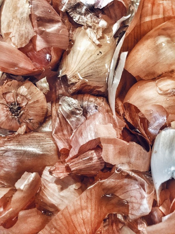 La technique dite des « pelures d’oignons » nécessite peut-être un poil plus d’anticipation que les deux autres, puisqu’il s’agit ici de garder des pelures d’oignon pour teindre nos petits œufs.