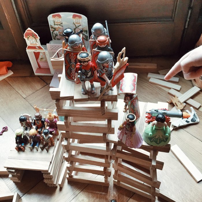 De retour à la maison, hier dimanche, les enfants ont joué, joué, joué. Toute la journée. Si bien que les grands ne sont pas sortis du tout, et que c’est bien la première fois que cela nous arrive. Jusqu’à maintenant se faisait toujours ressentir le moment où il fallait aller dégourdir un peu pattes et esprits afin que la sérénité et le calme refassent leur place, le soir venu. Mais hier, ce n’était pas le cas. Les playmobils et les kapplas ont occupé tout l’espace, les histoires et mises en scène se sont entremêlées et poursuivies. J’essayerai de vous parler une fois de ces parties de jeux auxquelles se livrent Maude et Elie, il faut juste que je trouve les bons mots pour raconter avec justesse et précision ces beaux moments.
